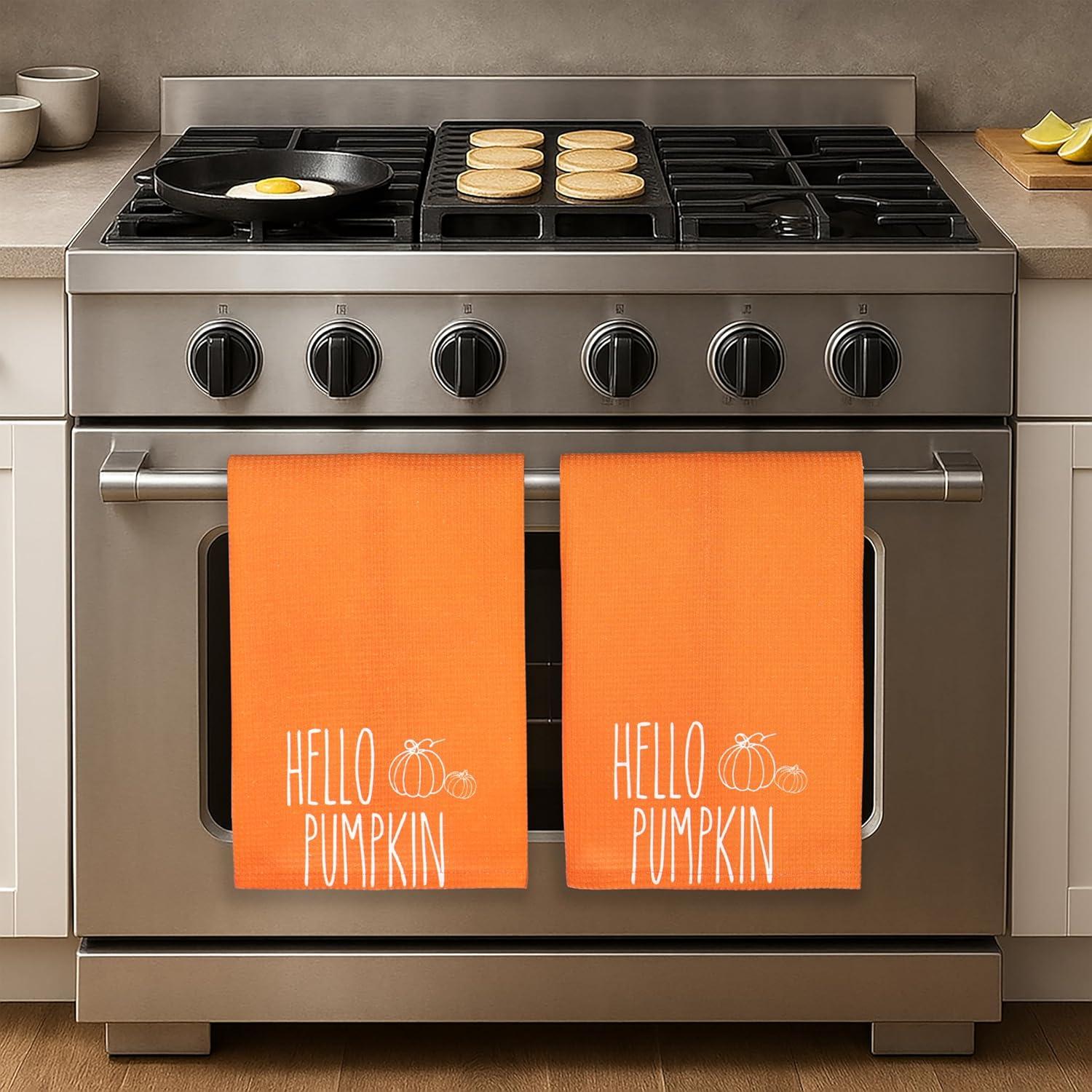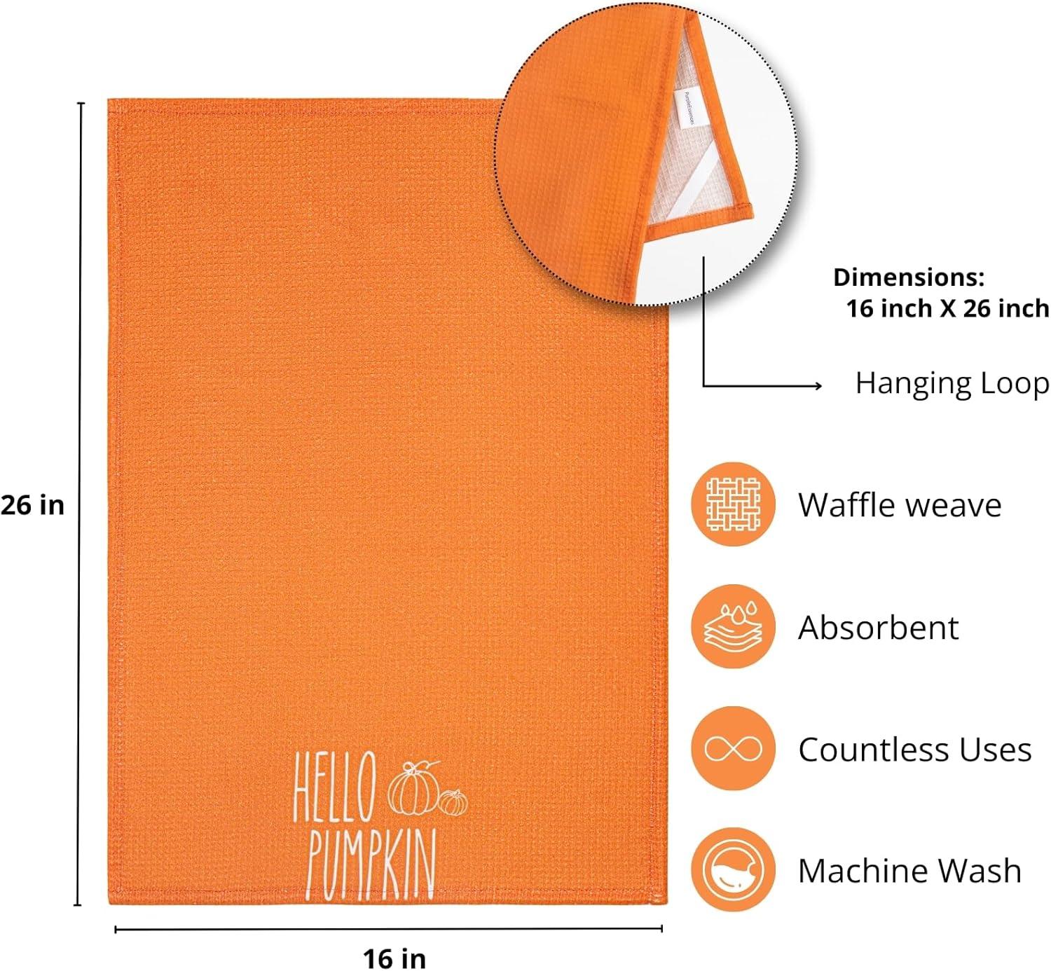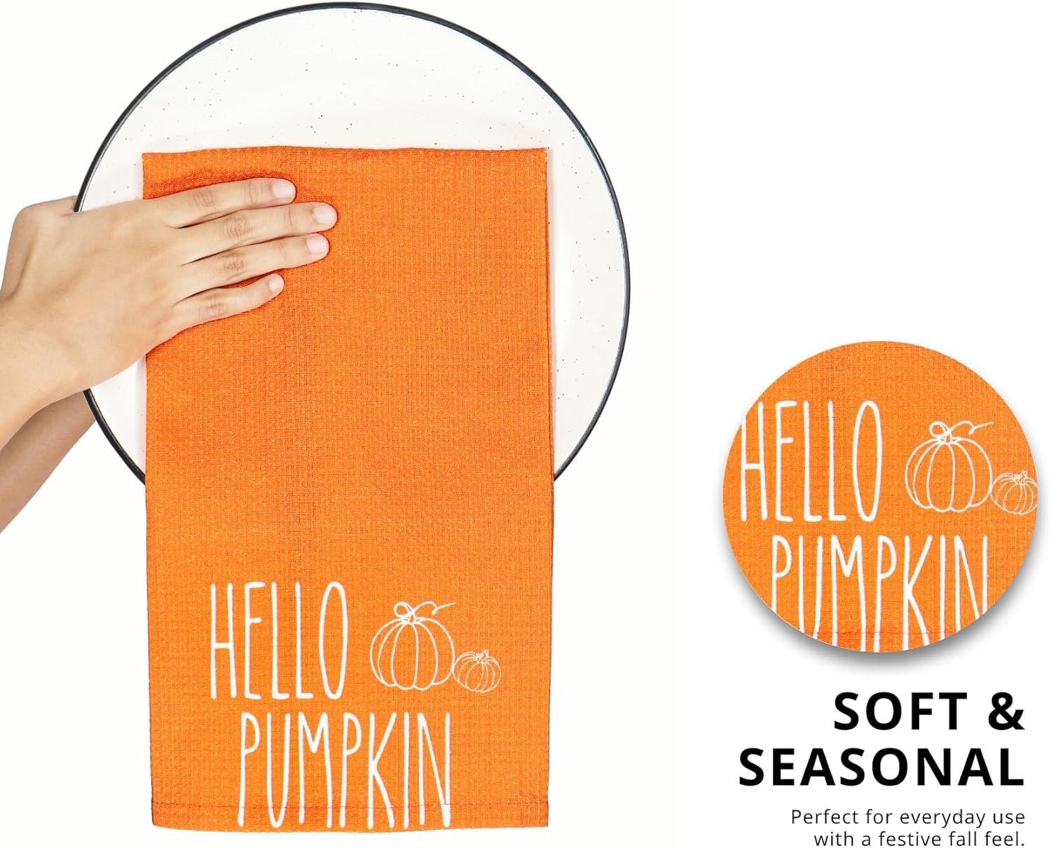 PurpleEssences Pumpkin Cotton Kitchen Towels Set of 2 – Absorbent Dish Towels Set Tea Towels Bar Towels Multi Purpose Kitchen Linen, Drying Dish Hand Towels 16 x 26 Inch – Pumpkin Patch(Hello Pumpkin)