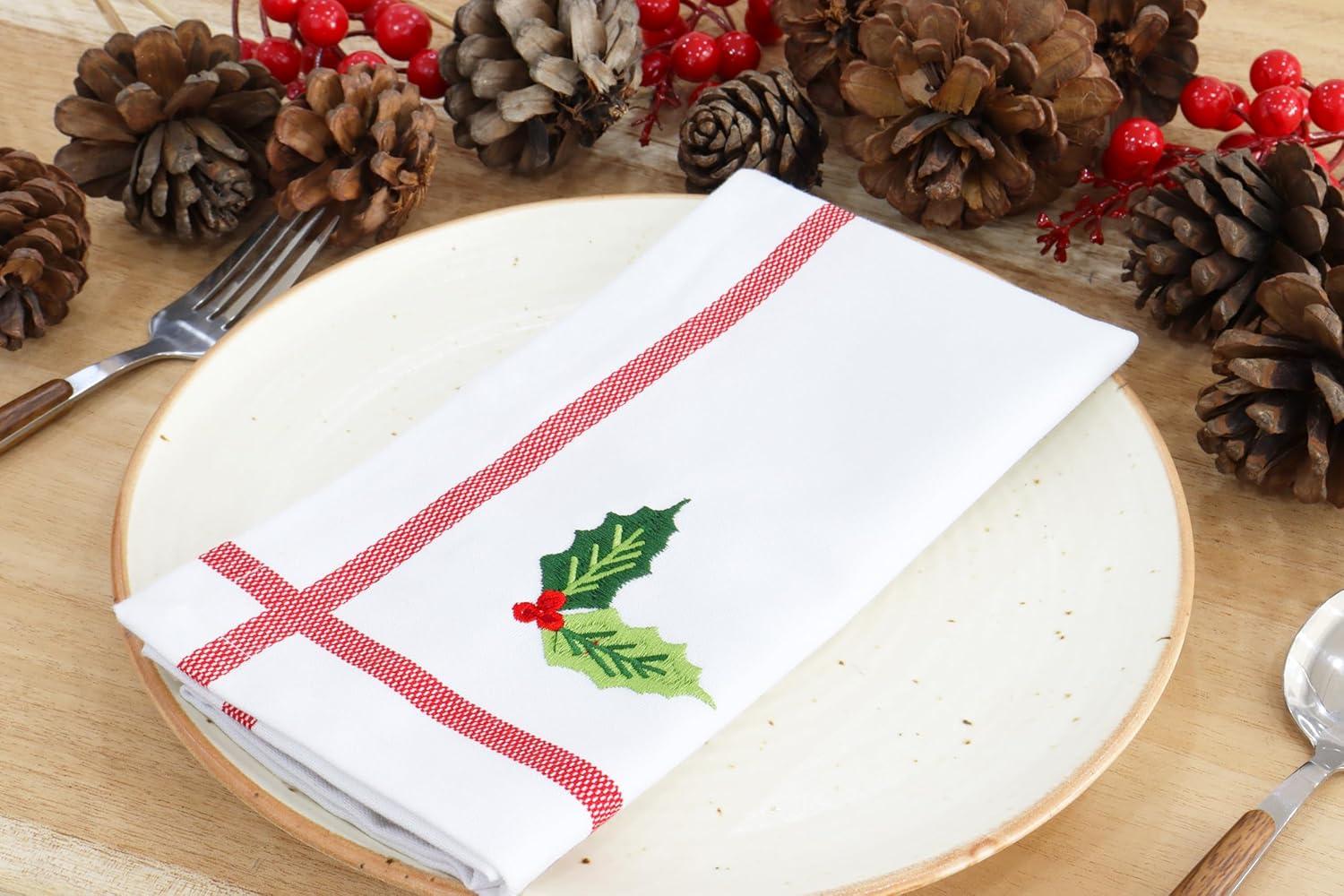 PurpleEssences Christmas Cloth Napkins – Set of 6-100% Cotton – Soft Durable Washable Dinner Napkins 18×18 – Mistletoe – White Red Green(White Red Green – Embroidery Mistletoe)