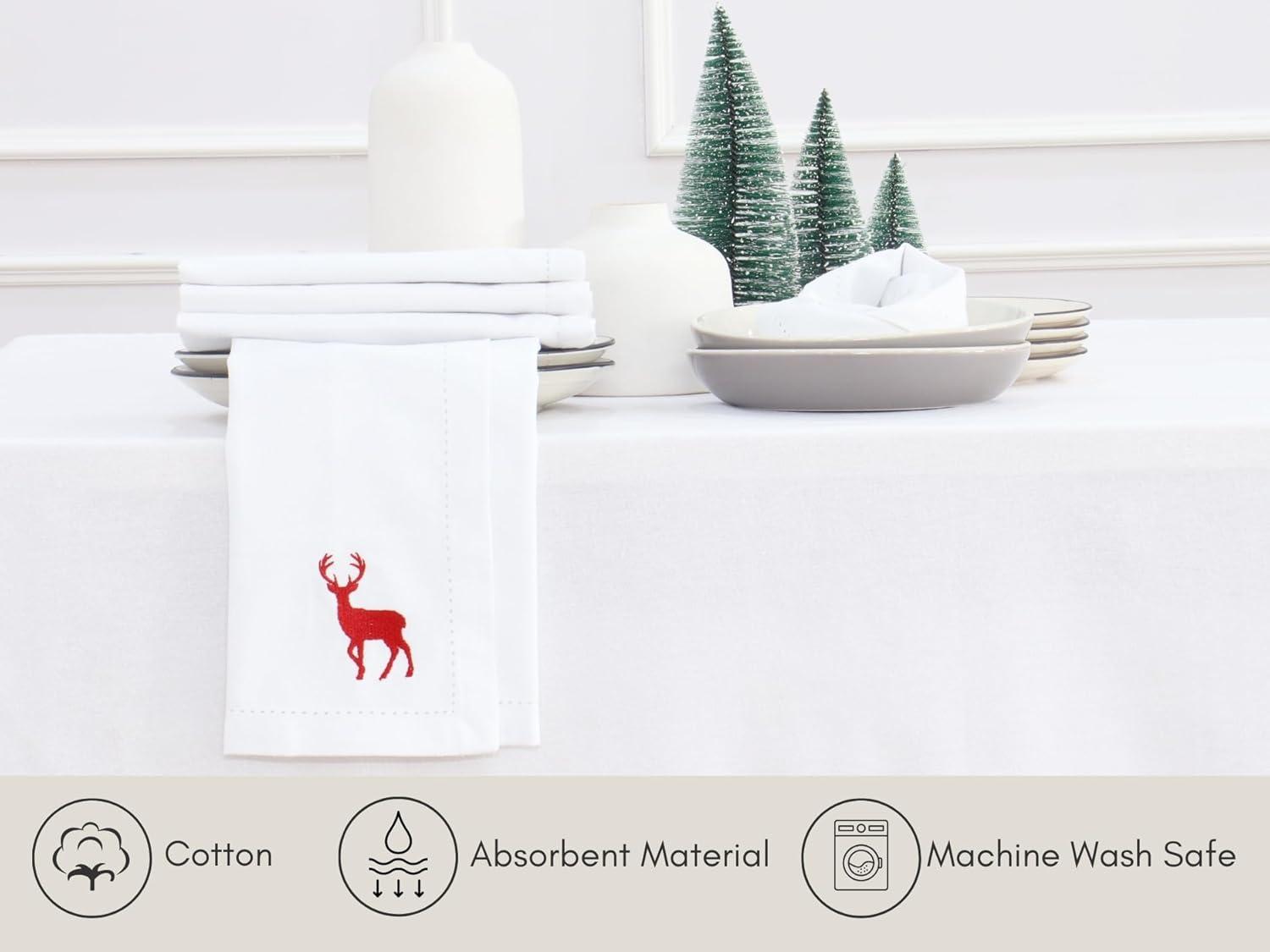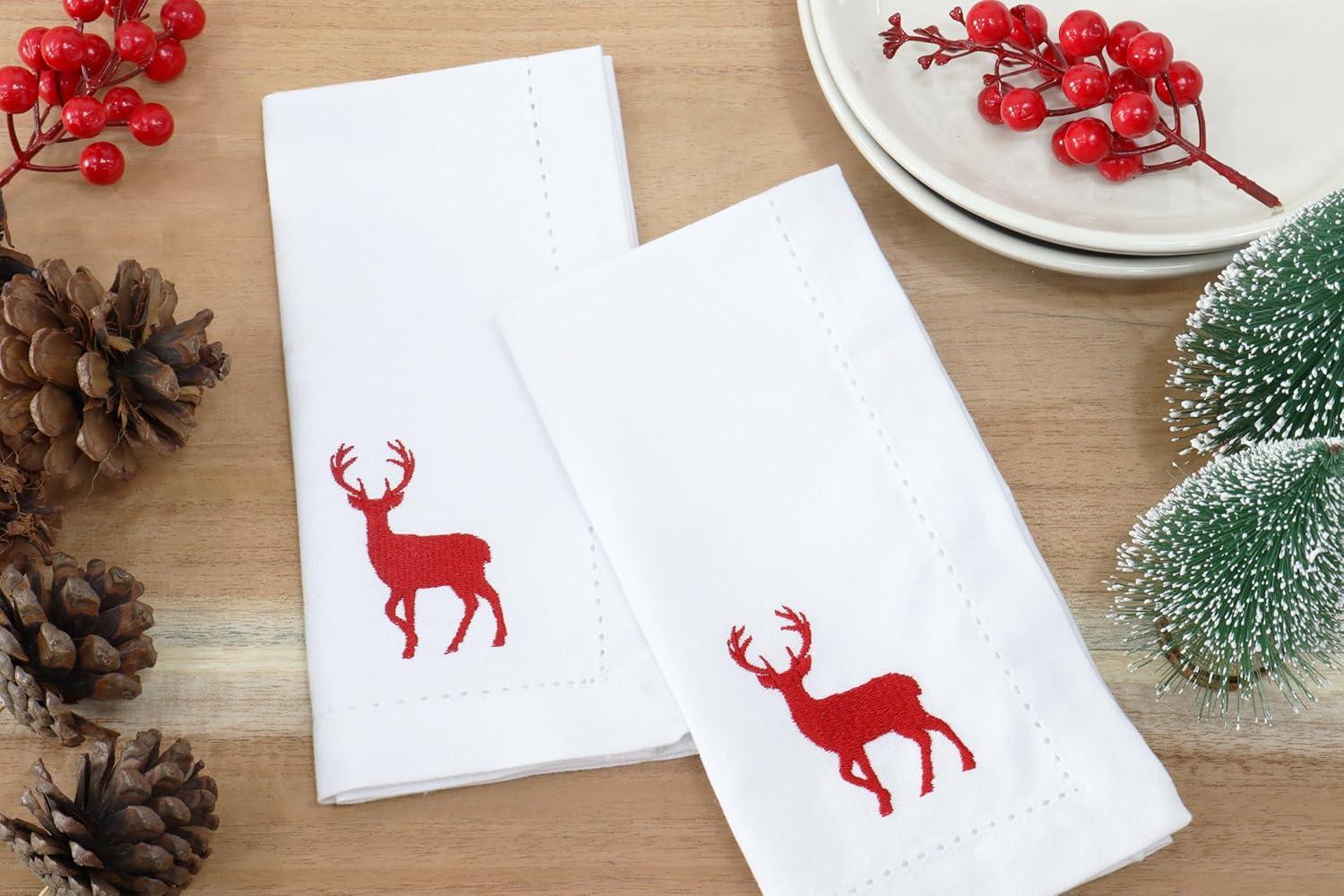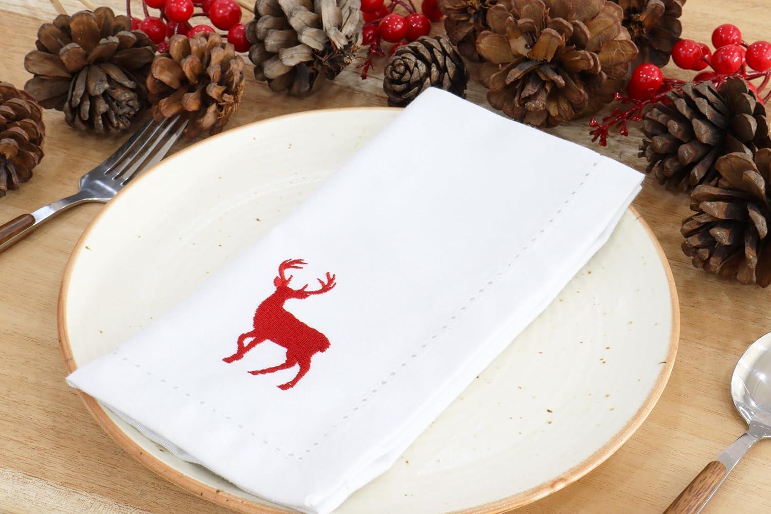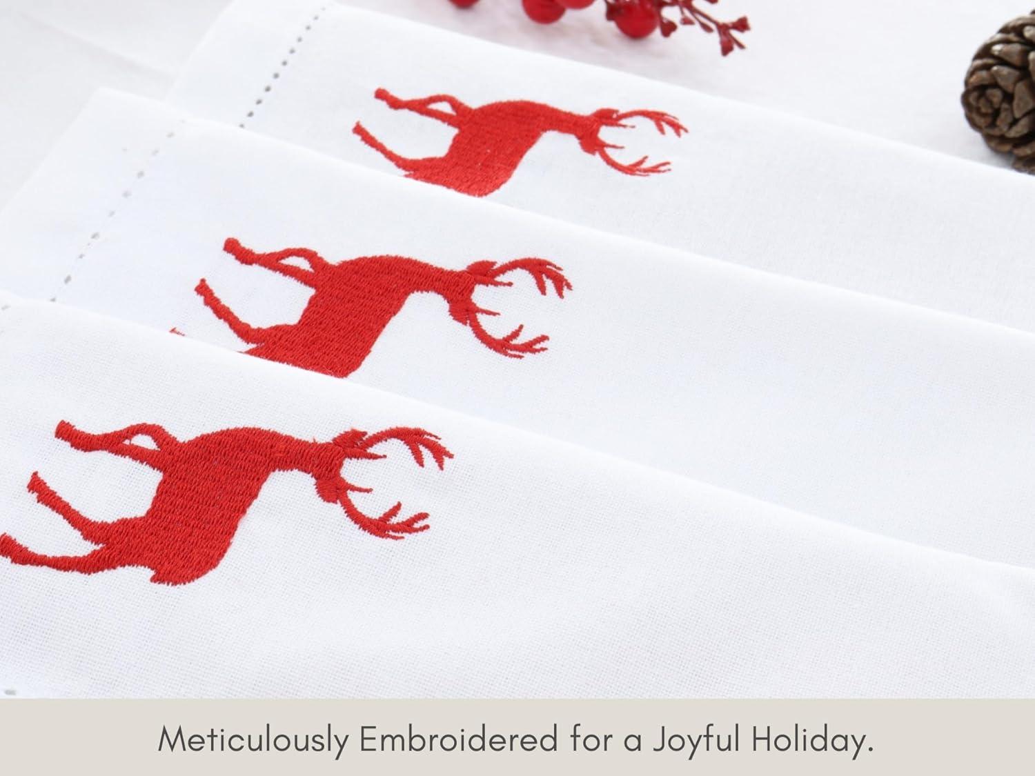 PurpleEssences Christmas Embroidered Hemstitch 100% Cotton Napkin for Holidays, Family Gatherings & Dinner – Set of 6-18×18 inch – Red – Snowflakes(White – Reindeer)