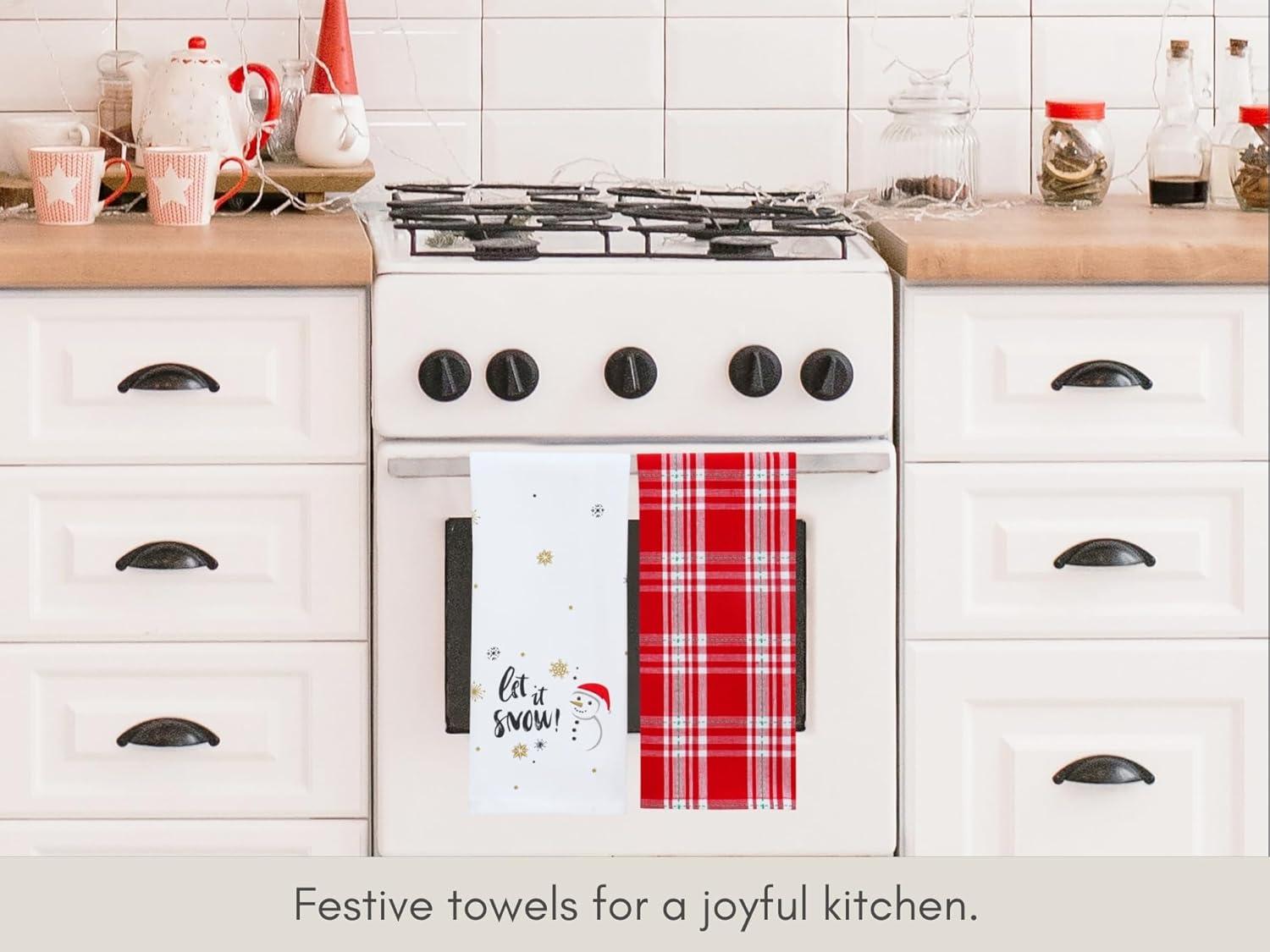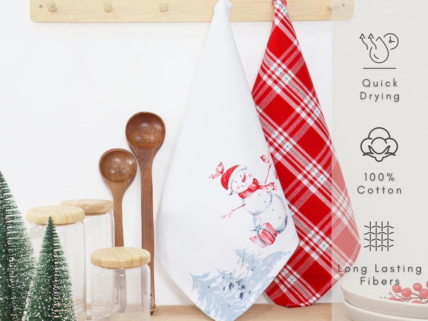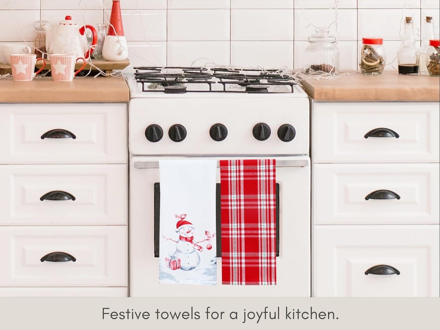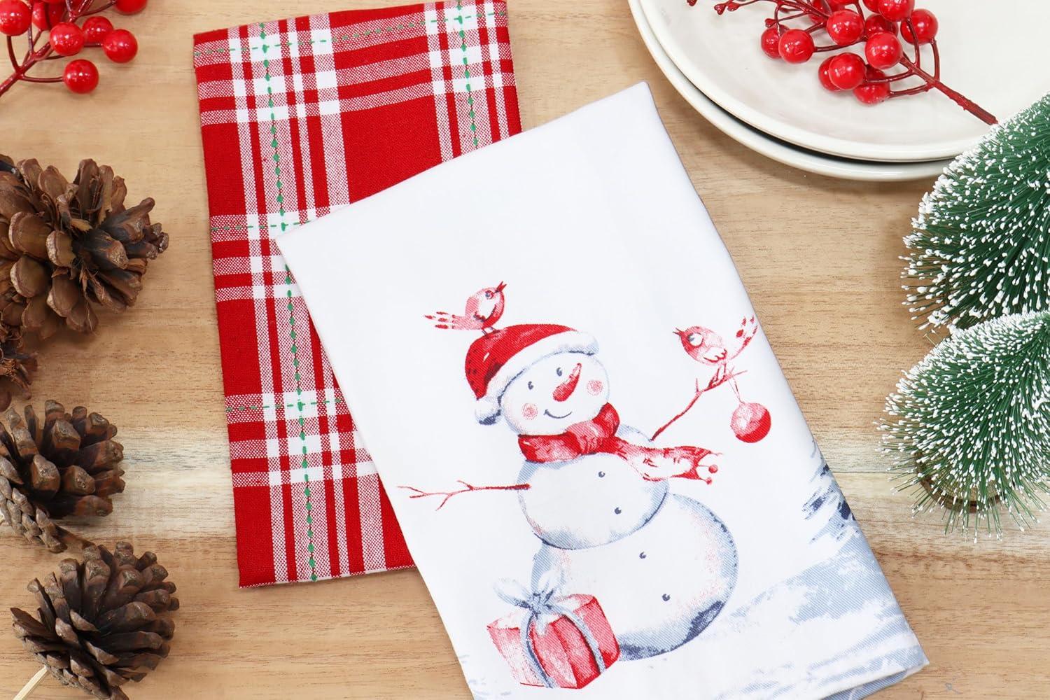 PurpleEssences Christmas Kitchen Towel Set of 2-100% Cotton Tea Towels for Baking, Cleaning, Entertainment & Cooking, Holiday – Snowman and Plaid(Let It Snow and Plaid)