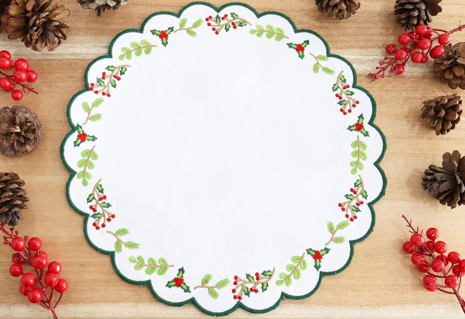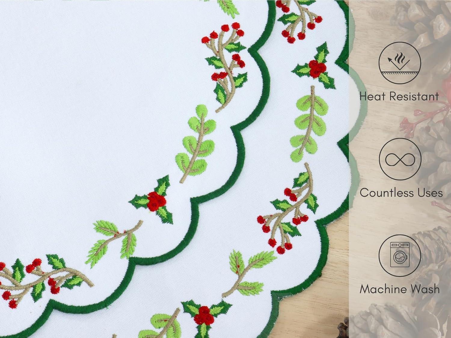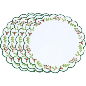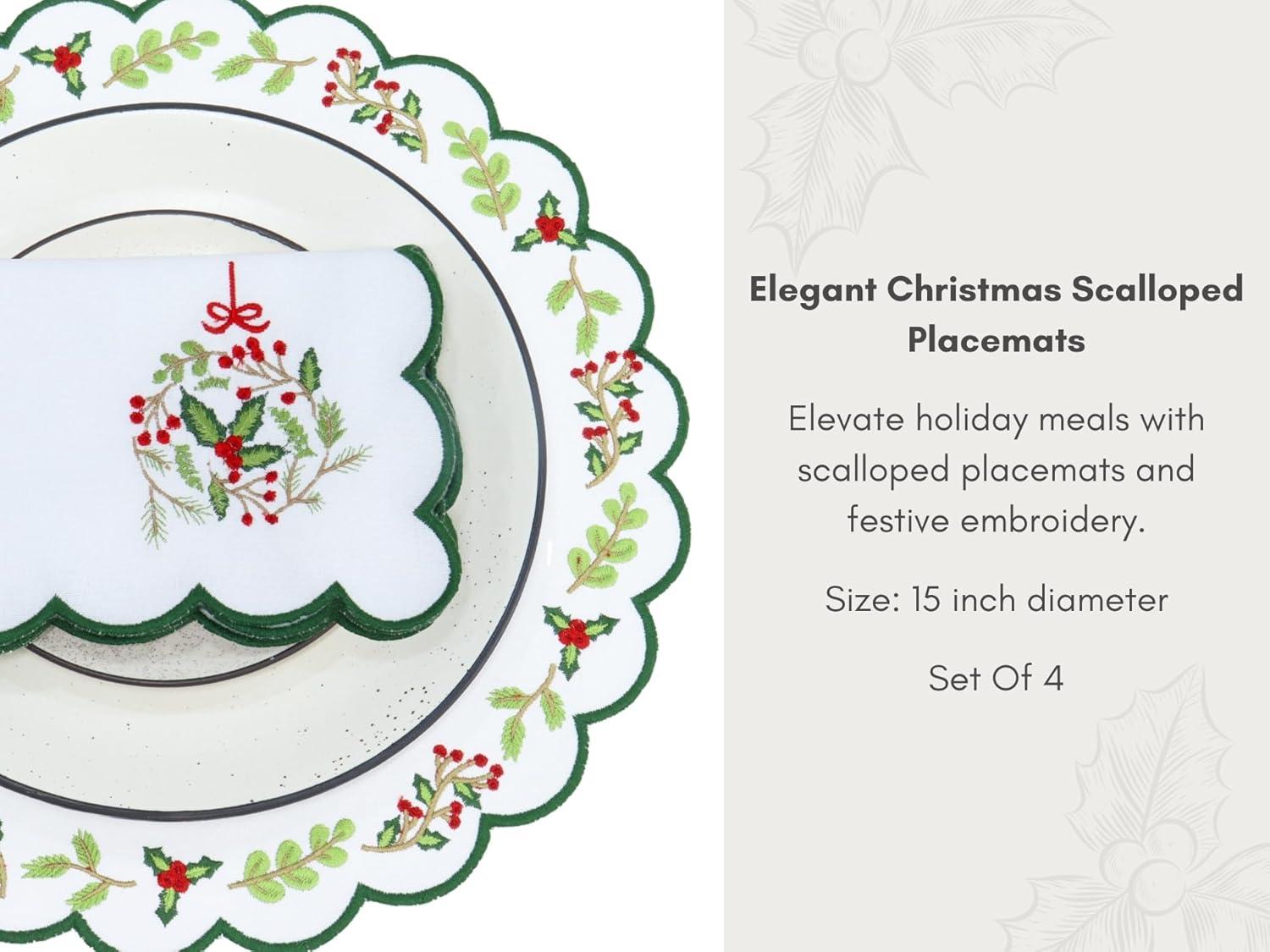 PurpleEssences Embroidered Christmas Round Placemats Set of 4, 15 Inch Winter Round Table Mats for Dining Decoration (Red Green Edges Green, 15″ Dia)(Red Green Edges Green)