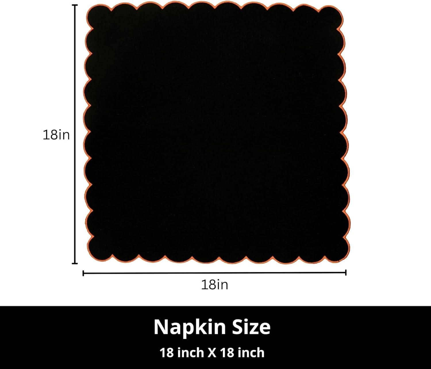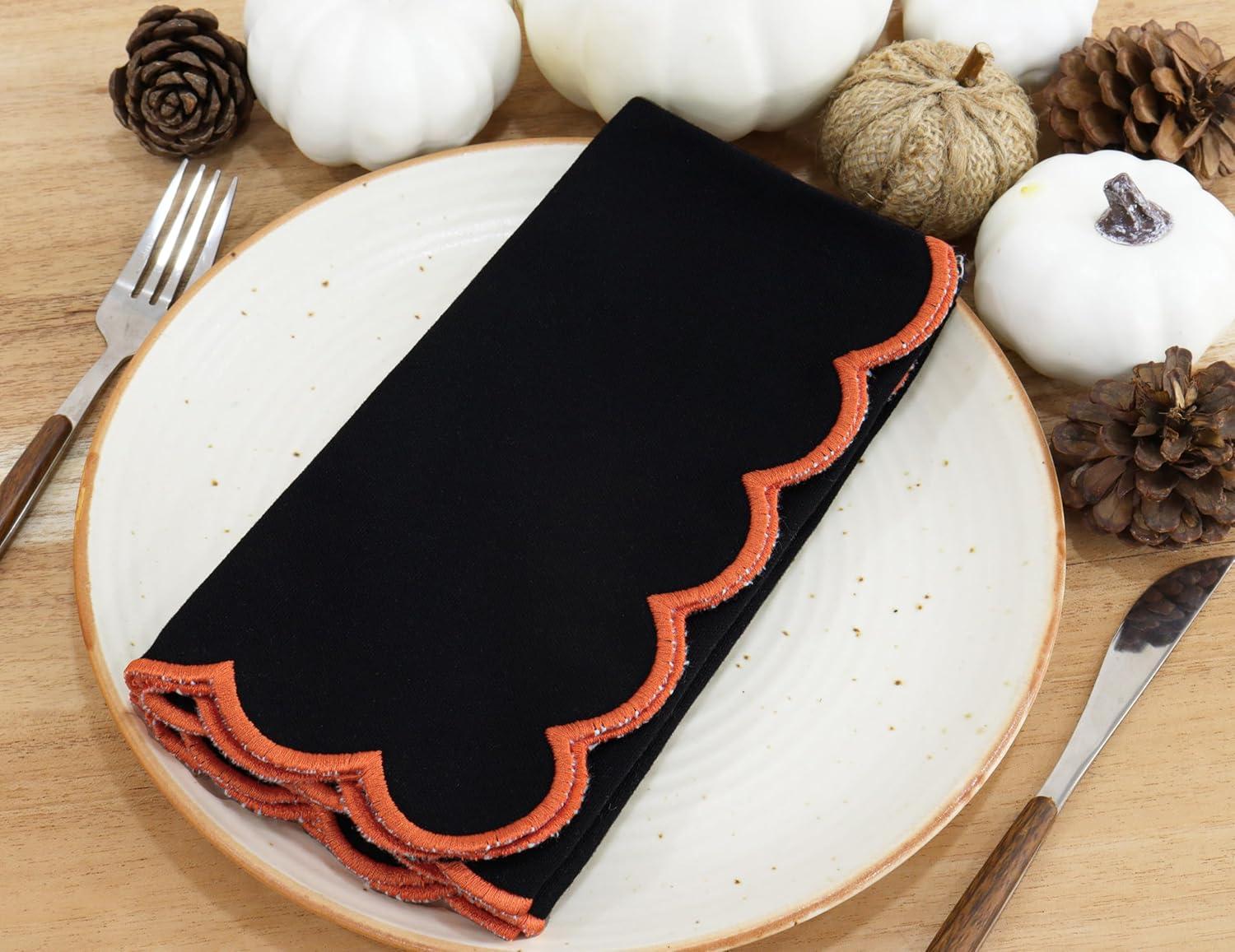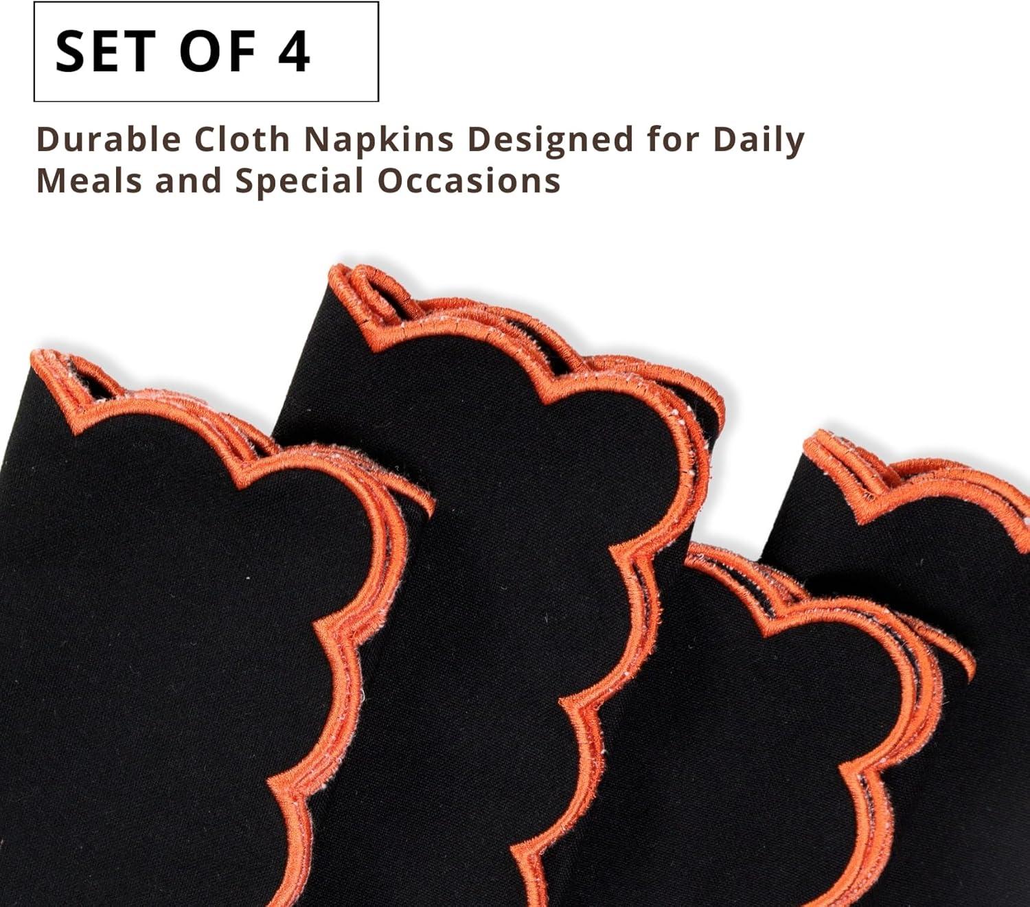 PurpleEssences Scalloped Embroidery Cloth Napkins Table Decor Fall Thanksgiving 100% Cotton Set of 4-18 x 18 inch – Aurelia Edges – Rust(Black(edges- Orange))