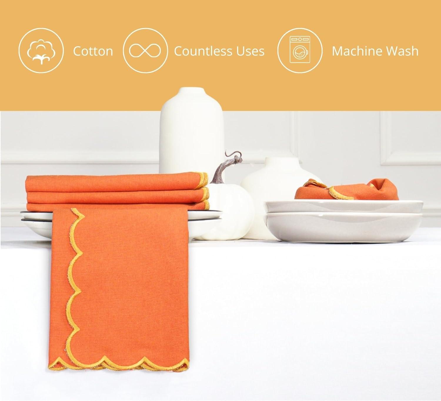 • PurpleEssences Scalloped Embroidery Cloth Napkins Table Decor Fall Thanksgiving 100% Cotton Set of 4-18 x 18 inch – Aurelia Edges – Rust(Golden Yellow(edges- Orange))