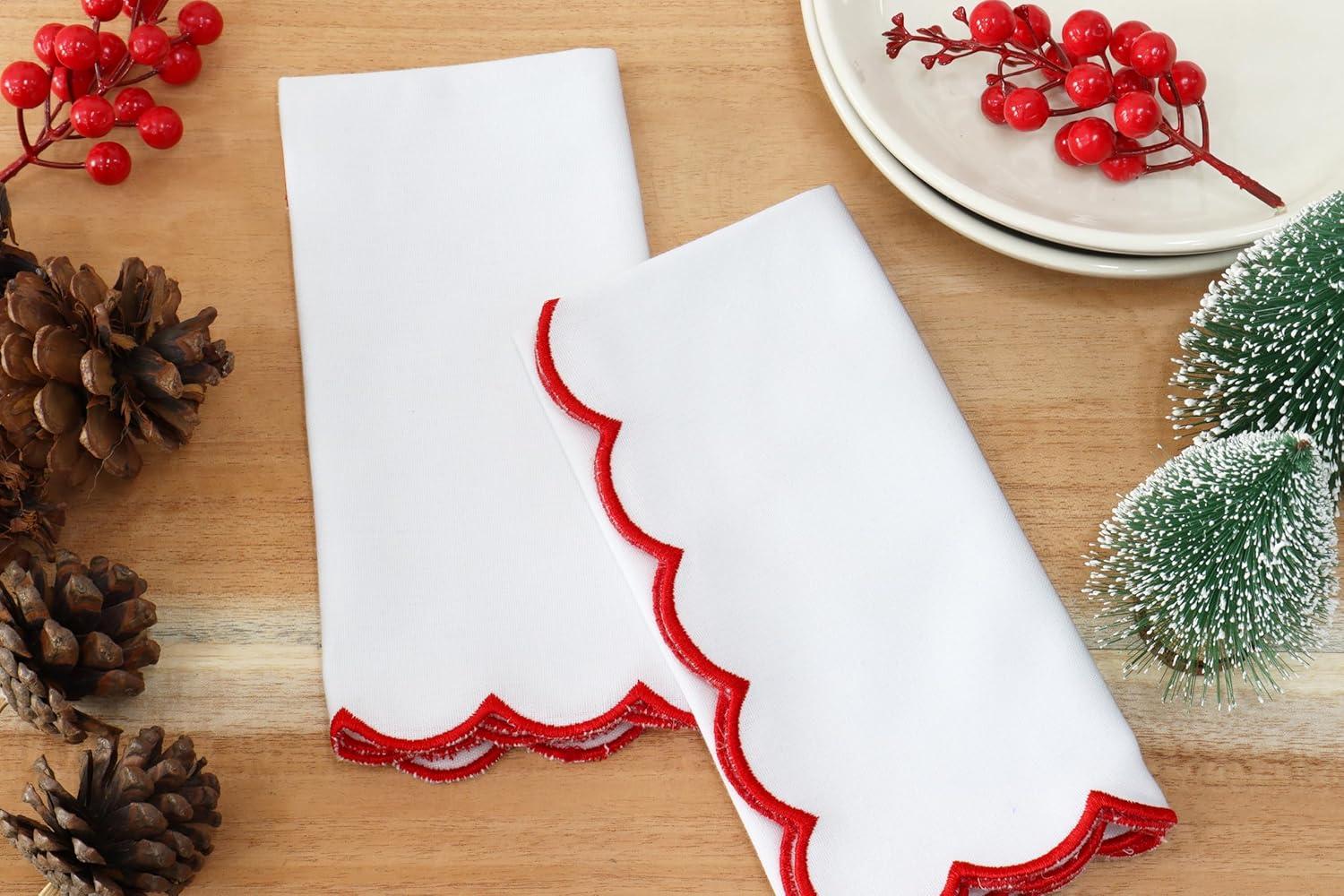 • PurpleEssences Scalloped Embroidery Cloth Napkins Table Decor Fall Thanksgiving 100% Cotton Set of 4-18 x 18 inch – Aurelia Edges – Rust(White(edges- Red))