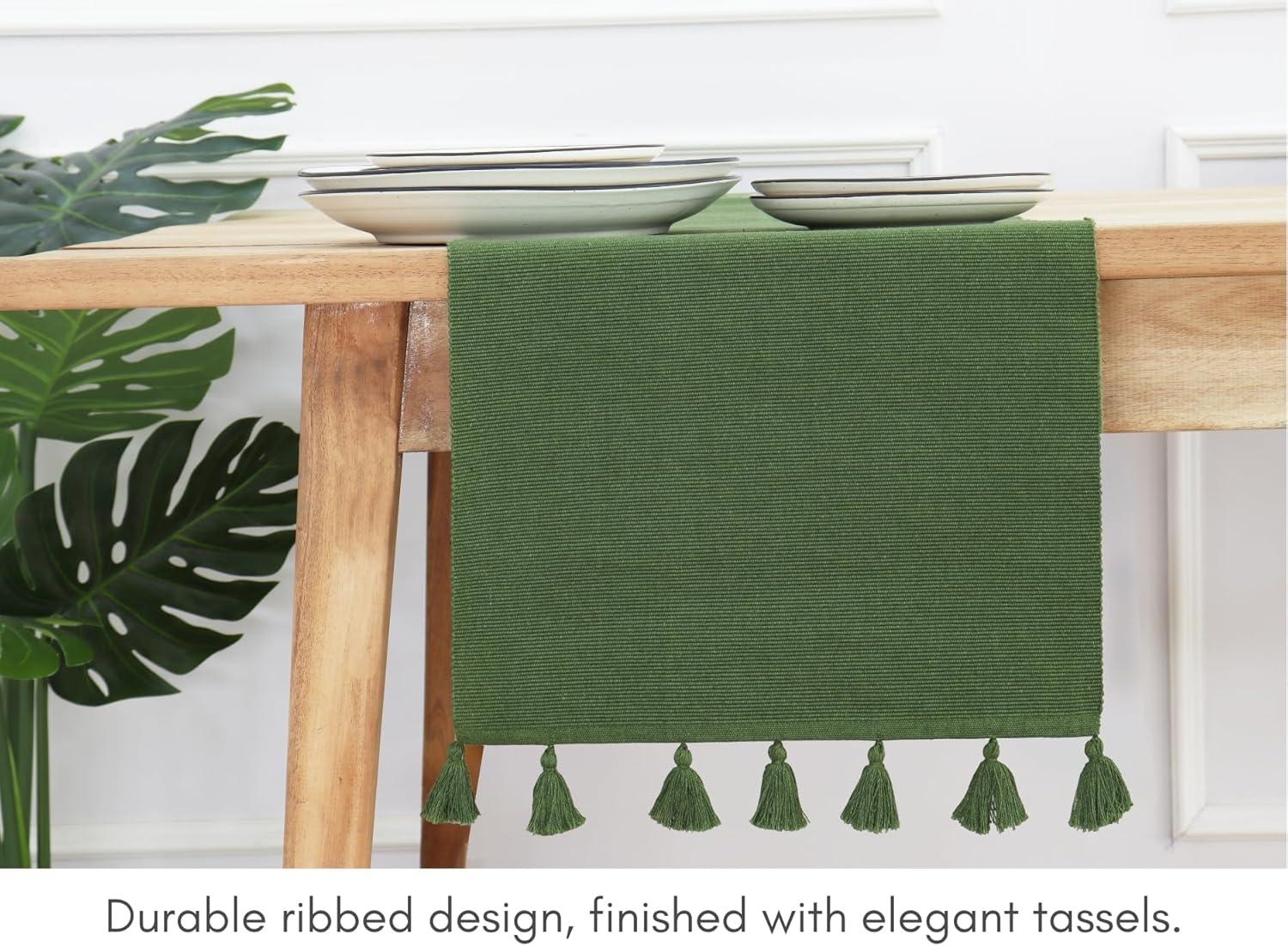 PurpleEssences Solid Ribbed Woven Table Runner with Multi-Tassels Farmhouse Dining Room – Perfect for Every Day and Seasonal Decor – Fall Thanksgiving – 13×90 Inches – Olive Green(Forest Green)