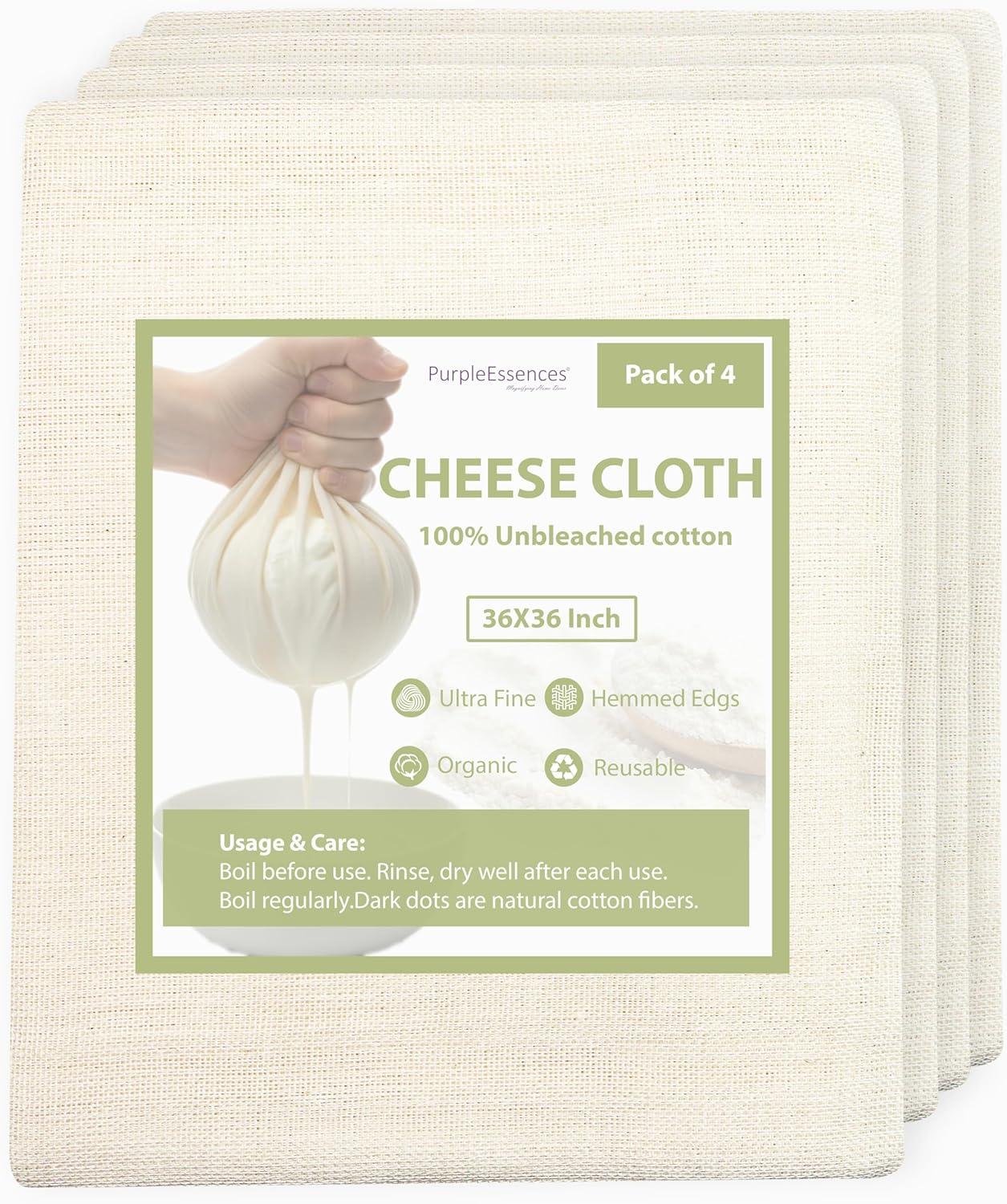 PurpleEssences Cheese Cloths for Straining 36×36 Inch – Reusable Unbleached Cotton Cheesecloth with Hemmed Edge for Cooking, Yogurt, Nut Milk, Broth & Crafts – Natural, Set of 4(36 x 36 Inch)
