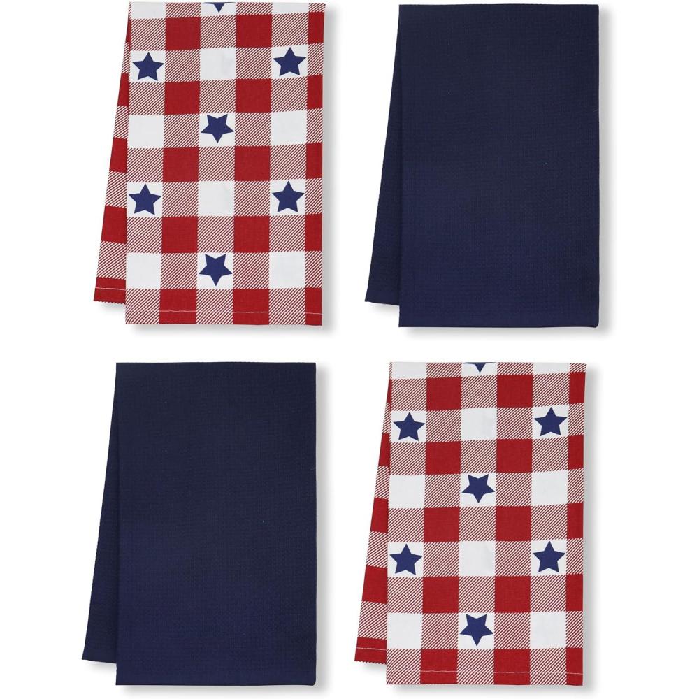 PurpleEssences 4th of July Assorted Kitchen Towels 100% Cotton – Pack of 4-18×28 Inches – Independence Day Indoor Decorations – Labor Day – Let Freedom Ring Stripe Flag America(Star Checks Print and Waffle)