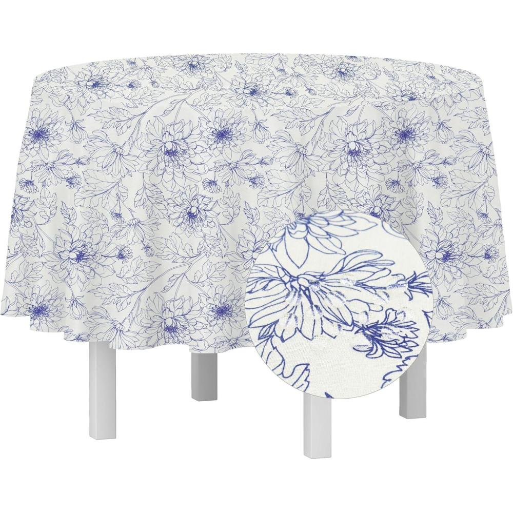 PurpleEssences Blue Floral Tablecloth Classic French Village Linen Fabric Table Cover Farmhouse Decoration 60 Inches Round/Oblong Blue for Spring Summer Easter Kitchen Dining(Blue Floral – Blue/Cream)