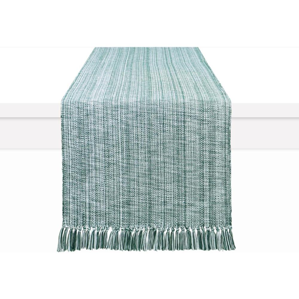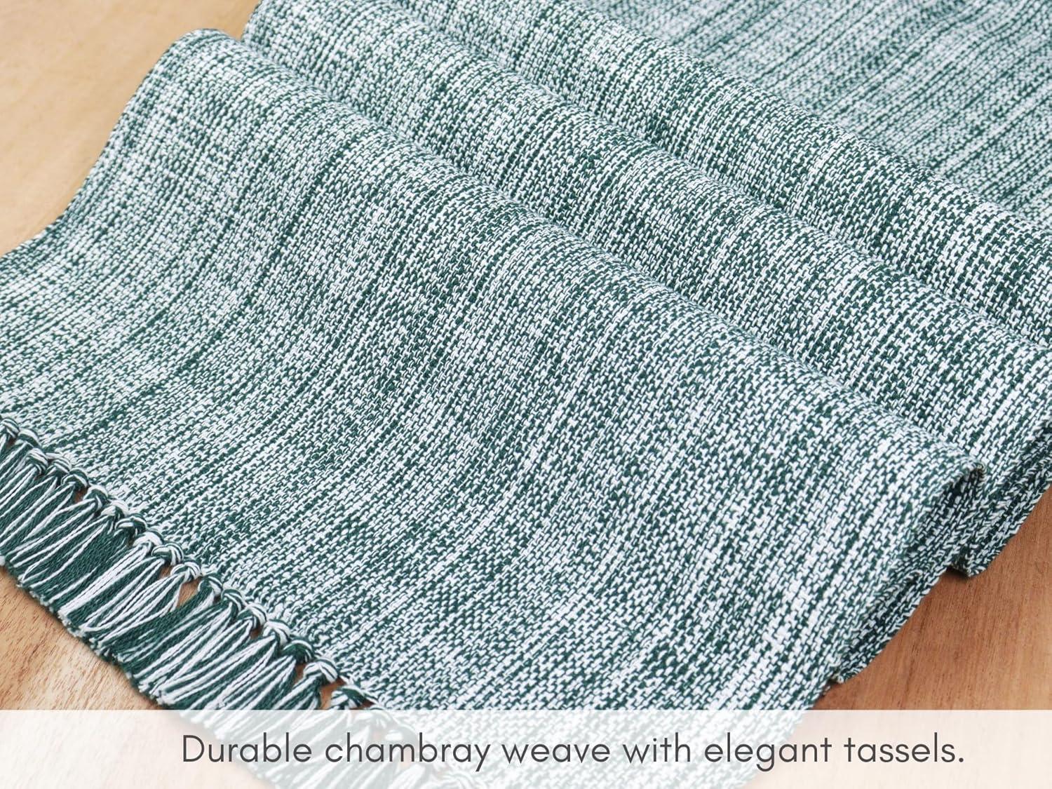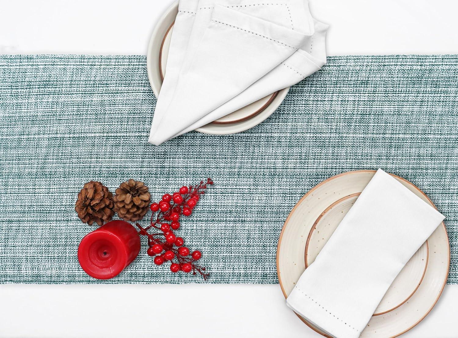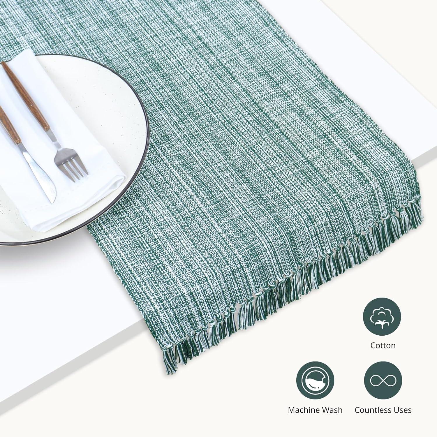 PurpleEssences Chambray Table Runner 100% Cotton, 13×72 Inch with Fringes Farmhouse Fall Thanksgiving Décor, Reusable, Machine Washable for Dining Table – Forest Green and H.White(Forest Green and H.white)