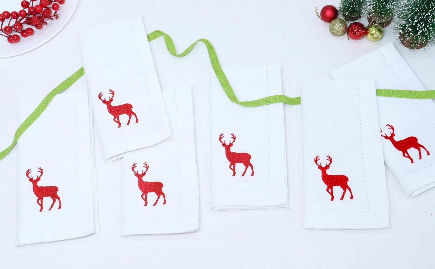 PurpleEssences Christmas Embroidered Hemstitch 100% Cotton Napkin for Holidays, Family Gatherings & Dinner – Set of 6-18×18 inch – Red – Snowflakes(White – Reindeer)