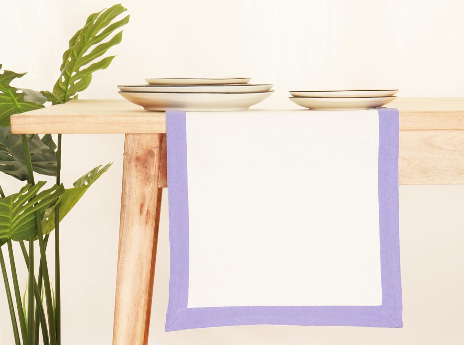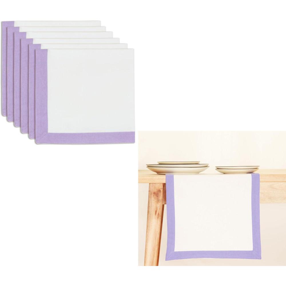 Lavender and White Dinner Napkins available in a set of 6, meticulously crafted from 100% Cotton. Each napkin measures a generous 18 x 18 inches, providing ample coverage and elegance to your table setting. MEASURES 14”x72” IN SIZE: Our dining table runner is 14-inches wide and 72-inches long. When laid centered and lengthwise, our runner is long enough to fit any standard size table comfortably and yet have enough cloth or material hanging over the edges. Easy Care: Machine washable, these napkins maintain integrity and age beautifully with minimal care. Mix n'Match: Coordinate seamlessly with our Solid Napkins and Runner collection for personalized style. Explore our range of colors to match your preference. Versatile Occasions: Perfect for weddings, showers, and year-round celebrations, enhancing your dining experience.