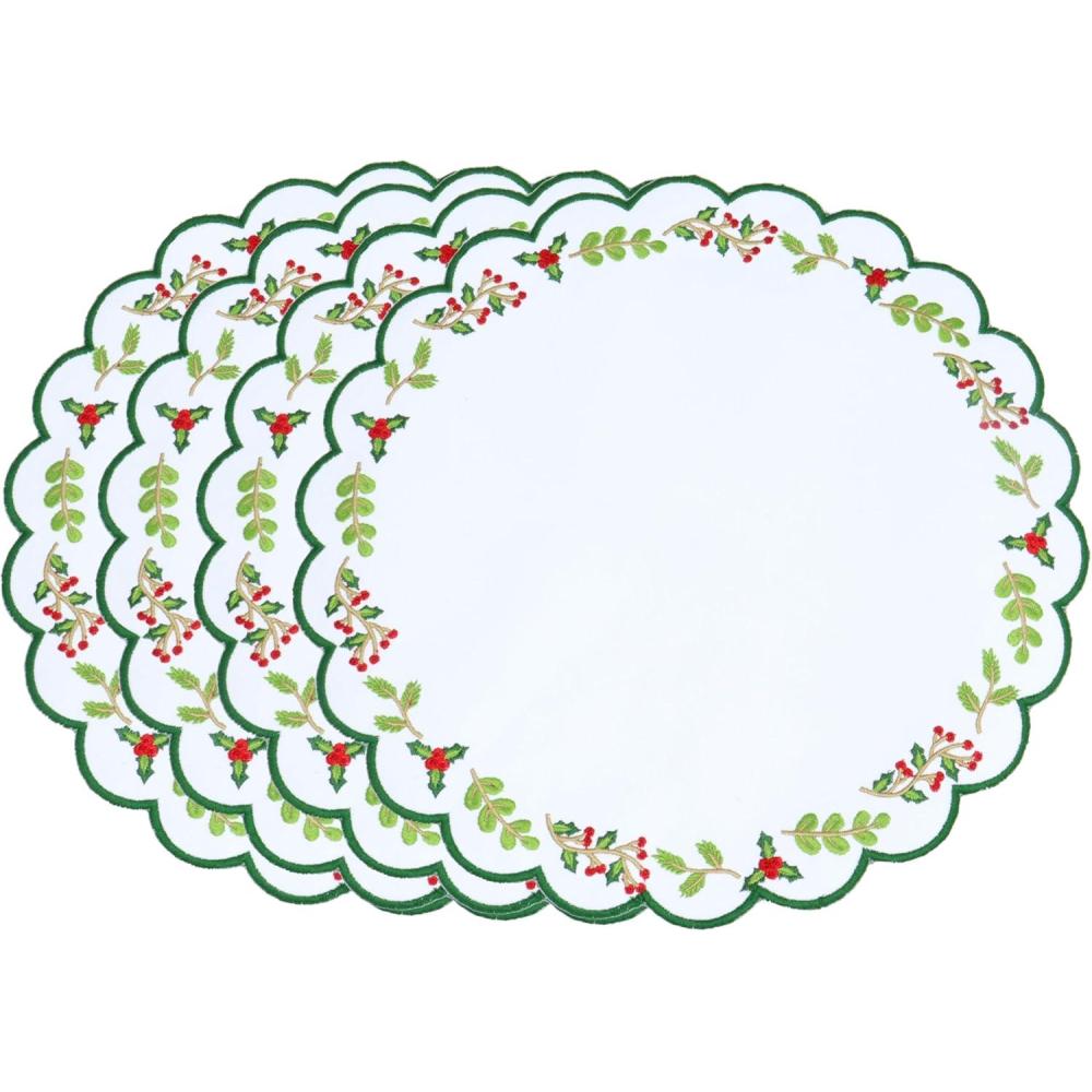PurpleEssences Embroidered Christmas Round Placemats Set of 4, 15 Inch Dia Winter Round Table Mats for Holiday Dining Decoration – Red Green Edges Red(Red Green Edges Green)