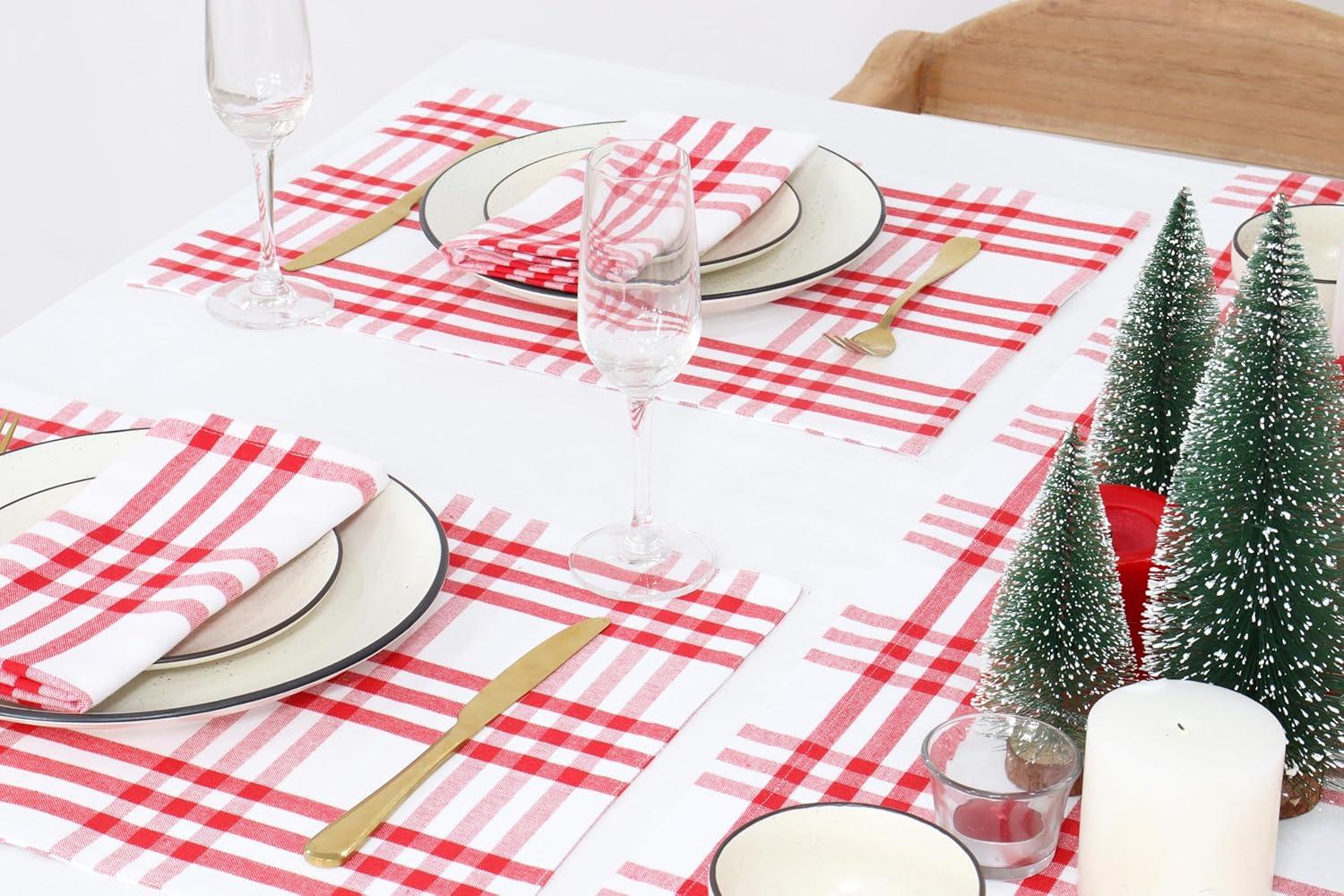PurpleEssences Homestead Plaid Table Runner 14”x72” Pack of 1, Napkin 18”x18” Set of 12, Placemats 13”x19” Set of 4 – 100% Cotton – Red