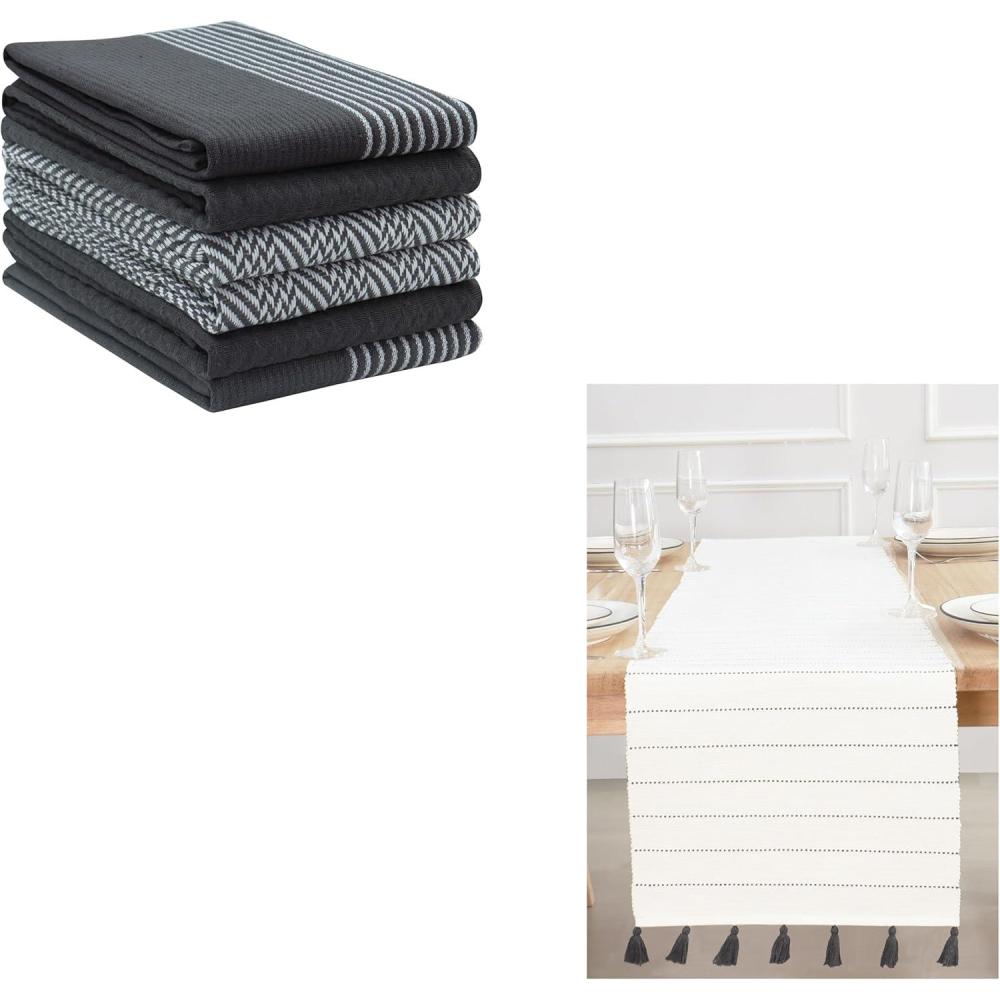 Pack of 6 Dish Towels measuring 15 by 25 Inches. UNIQUE DESIGN: Set of dish towels are lightweight, breathable and super absorbent, perfect to tackle all of your drying, wiping and cleaning kitchen tasks. And hanging loop design for easy placement and drying. MULTI-PURPOSE: Use them to wipe up spills, clean cutting boards, dry dishes, clean glassware and cookware. They are perfect for use in Restaurants, Bars and Homes. Enhance your dining experience with our 100% cotton table runner.Crafted entirely from cotton. For care, machine wash in cold water on a gentle cycle, lay flat to dry, and use a low iron if needed. Note that cotton may shrink. Our colorfast ribbed dobby stripe table runner is designed to make your dinnerware pop, offering a stylish statement. Available in various colors, it's easy to mix and match to suit any decor.