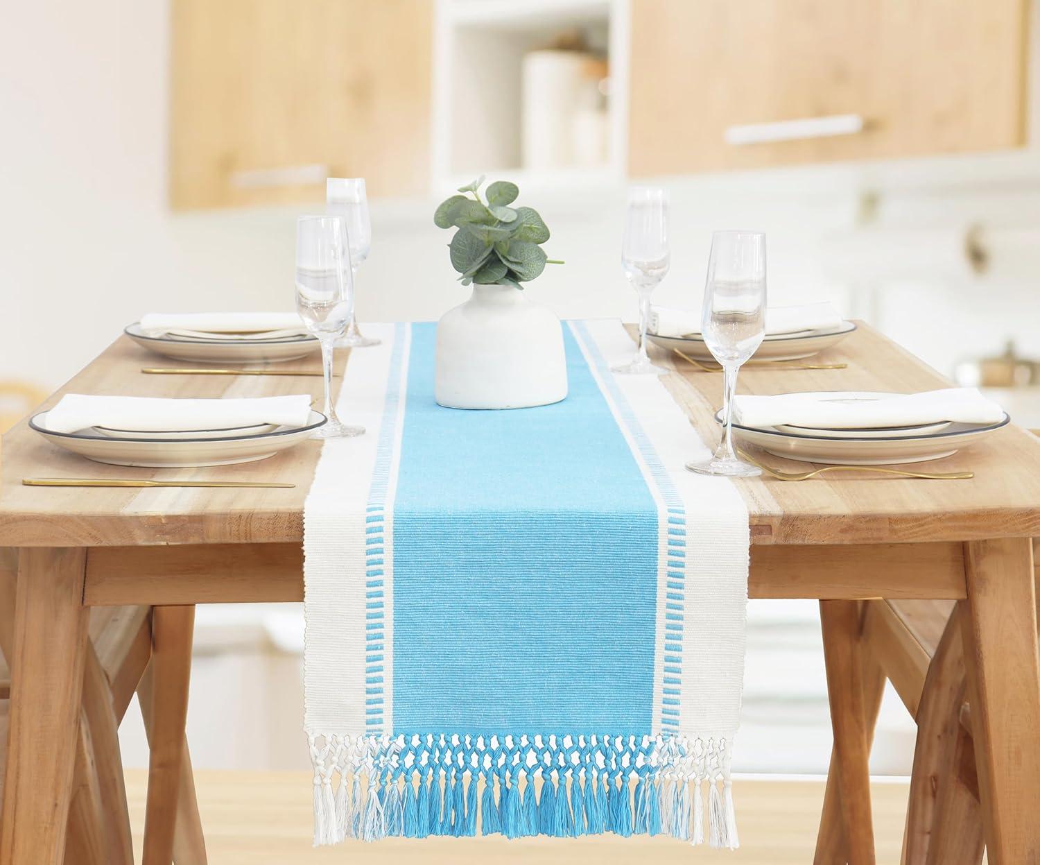PurpleEssences Rust Table Runner – Wide with Dobby Stripe, Heavy Ribbed Weave & Double Knot Fringes, 14×90 Inch (14×95.5 with Fringes) Boho Farmhouse Decor – Fall Thanksgiving – Rust and H.White(Aqua Blue and H.white)