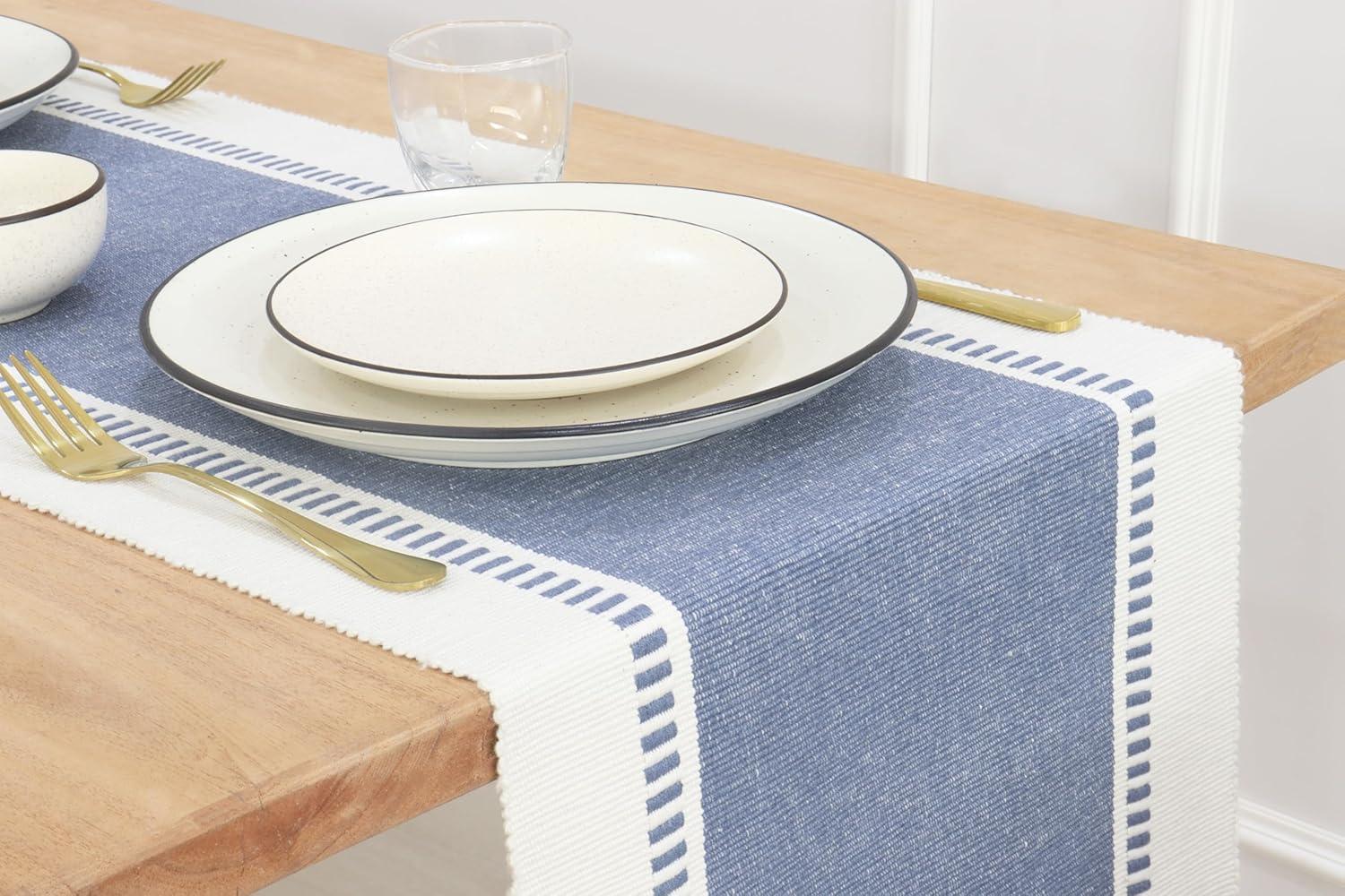 PurpleEssences Rust Table Runner – Wide with Dobby Stripe, Heavy Ribbed Weave & Double Knot Fringes, 14×90 Inch (14×95.5 with Fringes) Boho Farmhouse Decor – Fall Thanksgiving – Rust and H.White(French Blue and H.white)