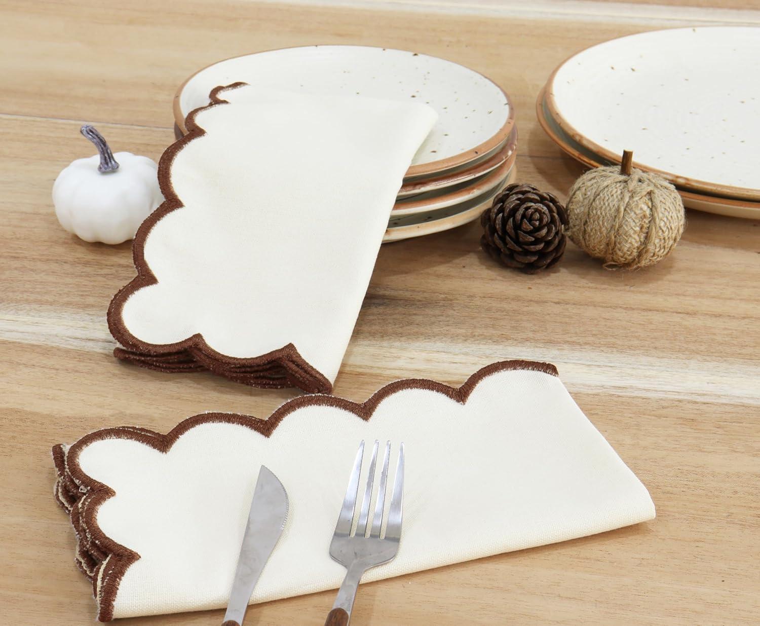 PurpleEssences Scalloped Embroidery Cloth Napkins Table Decor Fall Thanksgiving 100% Cotton Set of 4-18 x 18 inch – Aurelia Edges – Rust(Beige(edges- Brown))