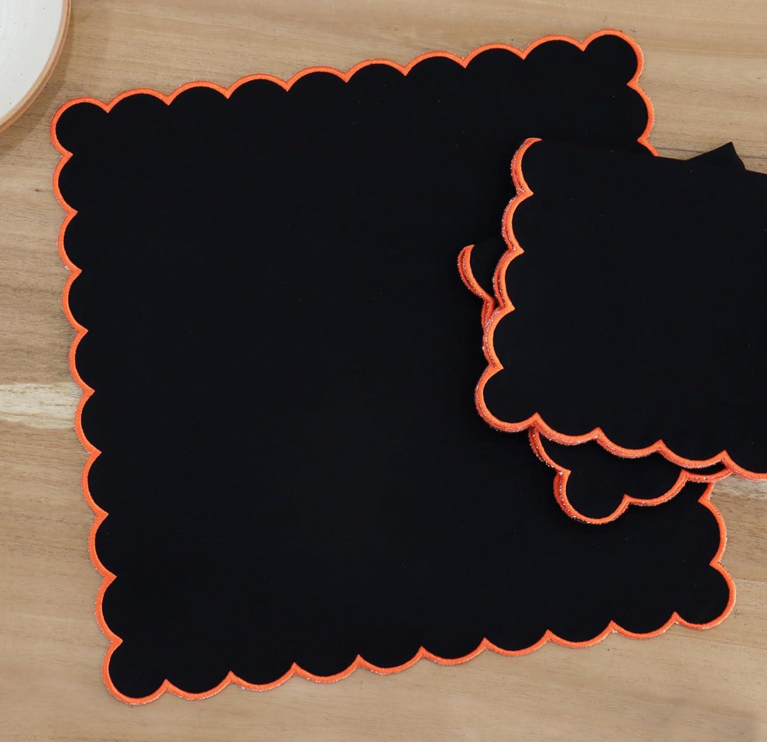 PurpleEssences Scalloped Embroidery Cloth Napkins Table Decor Fall Thanksgiving Halloween 100% Cotton Set of 4-18 x 18 inch – Black – Edges – Orange(Black(edges- Orange))