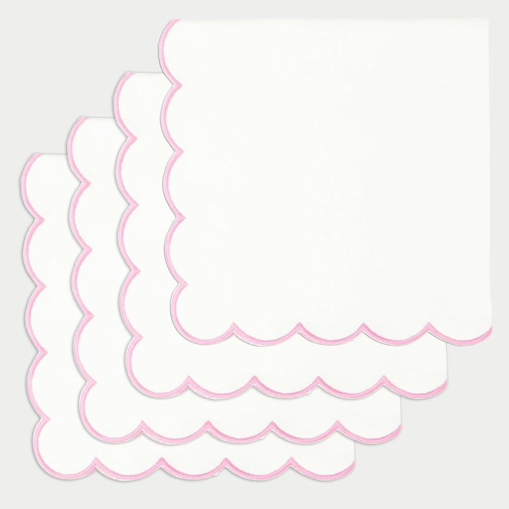This set of four cotton dinner napkins feature taupe satin stitch scallop trim around the border.