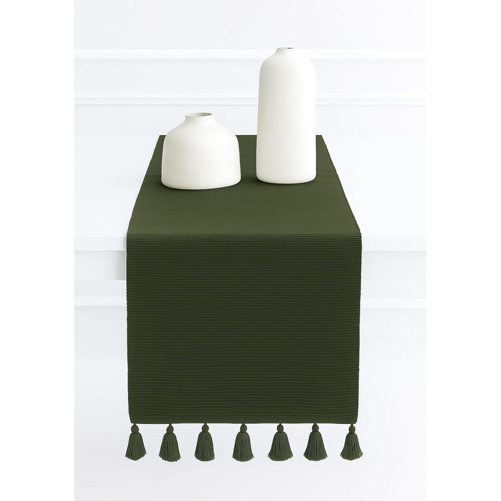 PurpleEssences Solid Ribbed Woven Table Runner with Multi-Tassels Farmhouse Dining Room – Perfect for Every Day and Seasonal Decor – Fall Thanksgiving – 13×90 Inches – Olive Green(Olive Green)