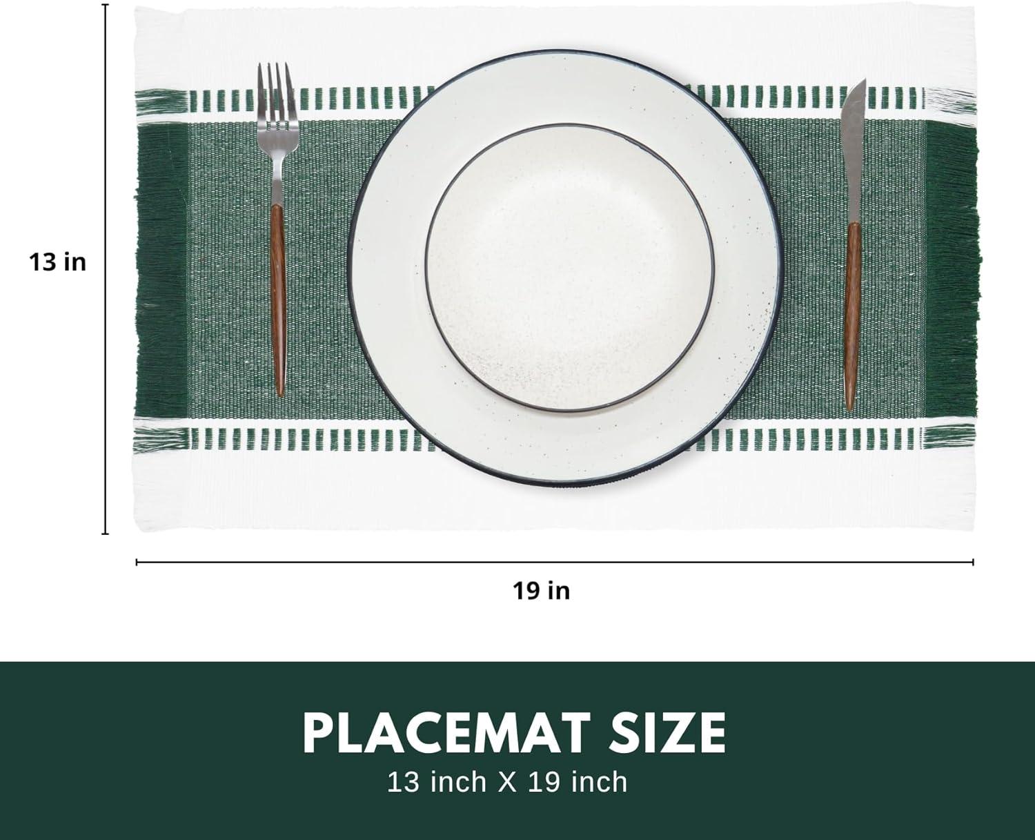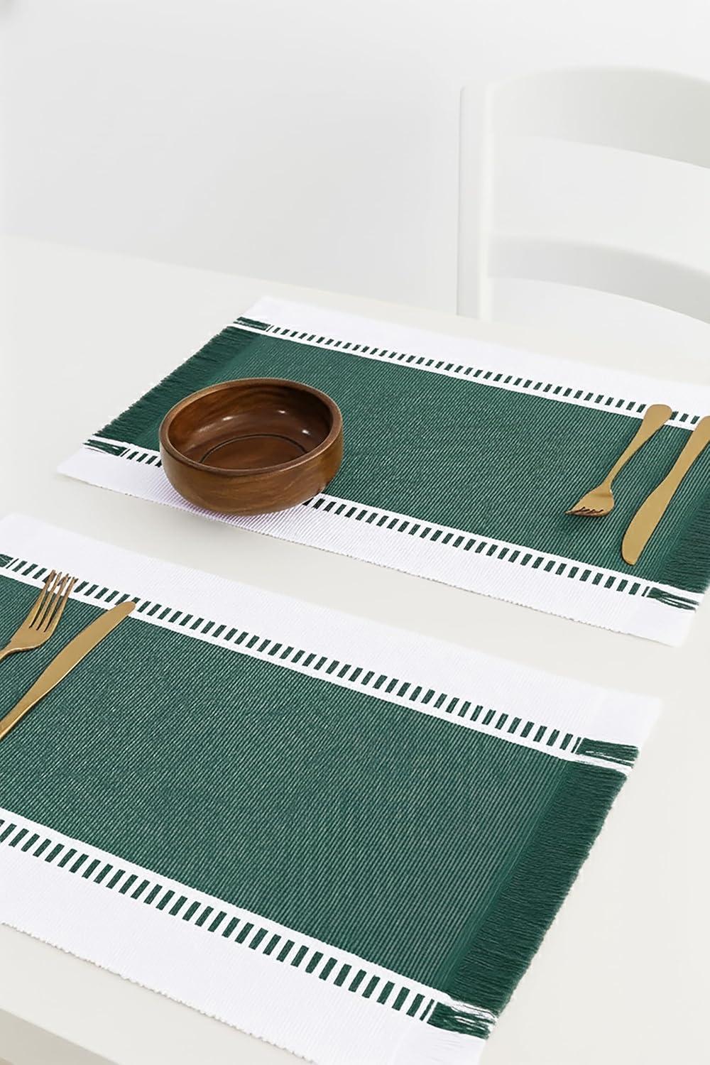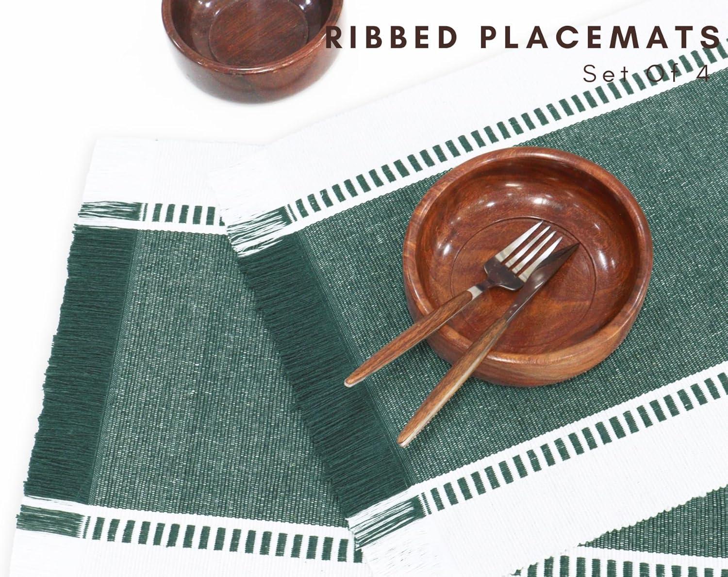 PurpleEssences Stripe Ribbed Placemats with Fringes 100% Cotton, Set of 4, 13×19 Inch, Thick Durable Table Mats for Dining, Kitchen, or Casual Farmhouse Tabletop Décor – Red and H.White(Forest Green and H.white)